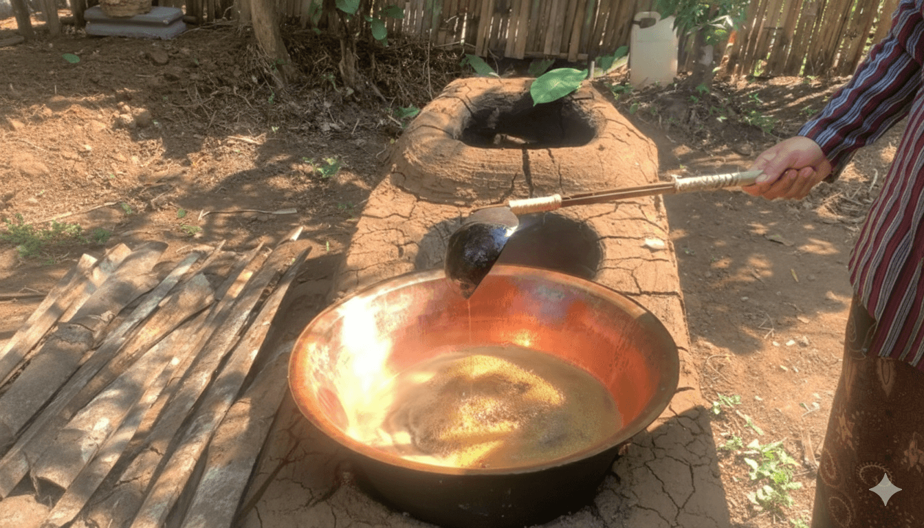 Siram yang masih panas dituang langsung ke dalam cetakan batok kelapa atau bambu, lalu dibiarkan memadat secara alami.